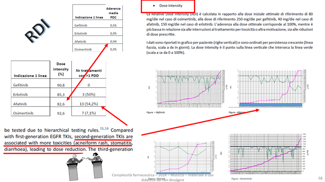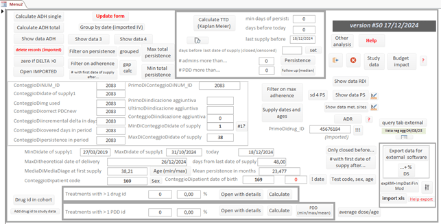 - Calcolare l’ADH media e mediana con i metodi della PDC e della MPR, calcolare la dose intensity percentuale, calcolare una stima della mediana della TTD, calcolare la percentuale dei pazienti in trattamento a vari tempi (3 mesi, 6 mesi, 1 anno, due anni, tre anni).