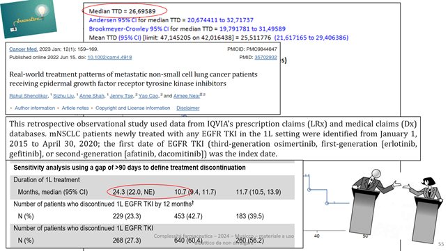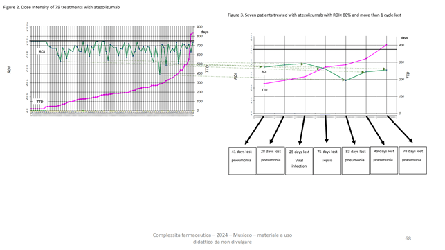 La durata dei trattamenti e l’aderenza sono gli indicatori validati più semplici da utilizzare. La durata (in genere TTD Time To Treatment Discontinuation) si correla al fallimento terapeutico soprattutto laddove l’uso del farmaco è appunto fino a che si instaurano fenomeni di resistenza o tossicità che ne consigliano l’interruzione. L’aderenza (ADH) alle dosi definite o prescritte è correlata all’efficacia e pertanto la sua riduzione è indice frequentemente di tossicità. Quindi soprattutto in ambito oncologico, ma non solo, è interessante conoscere il valore di questi indicatori nei pazienti trattati, confrontarli con i risultati degli studi sperimentali e osservazionali, usarli nell’ambito delle alternative terapeutiche per lo stesso problema clinico.
