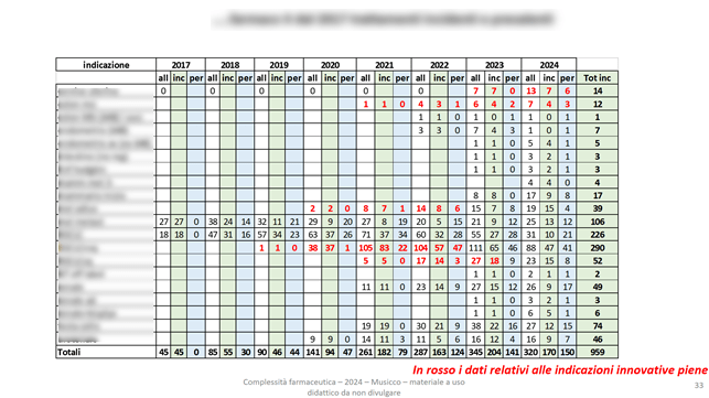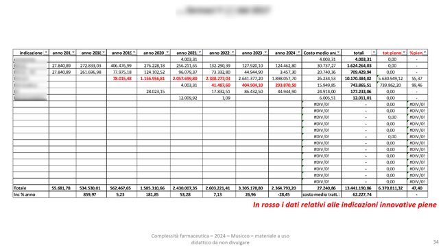 Alcune nostre analisi economiche valutano l’incidenza e la prevalenza per farmaco e indicazione, riportando anche in rosso i dati relativi alle innovatività piene: