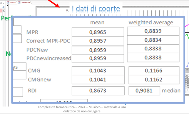 L’algoritmo tiene conto anche delle erogazioni anticipate, consentendo il calcolo di una PDC modificata che tiene conto delle dosi anticipate già consegnate, utilizzabili in caso di ritardo nelle erogazioni successive. Il valore medio ponderato di PDC così calcolato risulta compreso nell’intervallo tra la PDC e la MPR calcolata classicamente. È evidente che per ogni specifica farmaco-indicazione considerata, tenendo conto dei tempi e modi di erogazione/somministrazione raccomandati, va utilizzato il metodo più adatto scegliendo tra MPR, PDC e RDI.