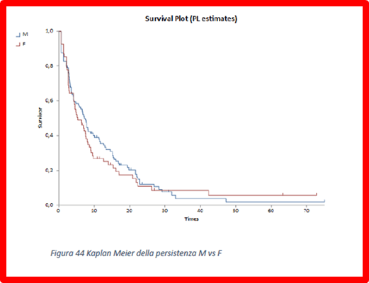 La figura rende immediatamente visibile come sta rispondendo la nostra popolazione trattata al farmaco, in quanto le punte fucsia in alto ci mostrano chi risulta in trattamento al momento della data della estrazione ultima dei dati. L’andamento della curva delimitata dai trattini fucsia che rappresentano l’inizio trattamento, indica invece visivamente quanti trattamenti iniziano nel tempo: più l’andamento è inclinato, più ne sono iniziati, più è verticale meno ne sono iniziati nel periodo di tempo che si legge sempre sulla scala di sinistra.